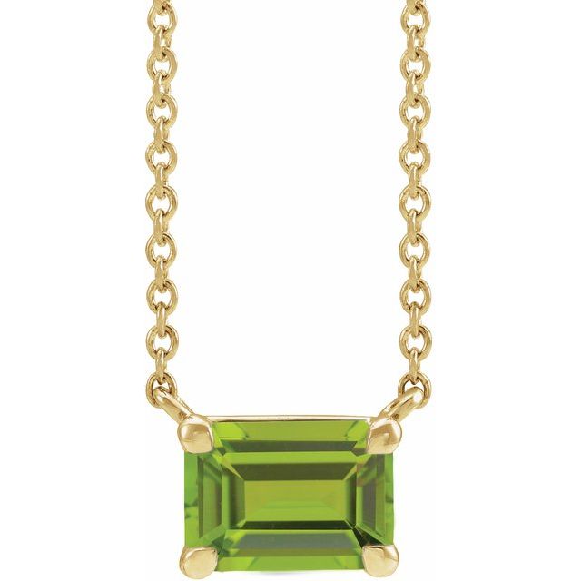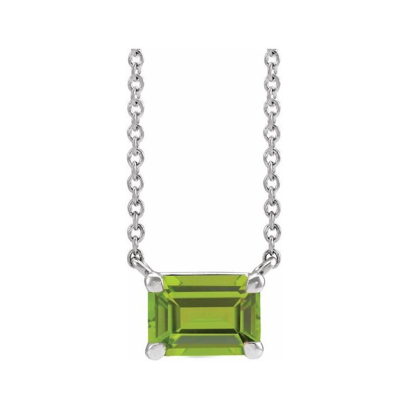 - Birthstone: Peridot (August), 5x3mm emerald cut, ethically sourced