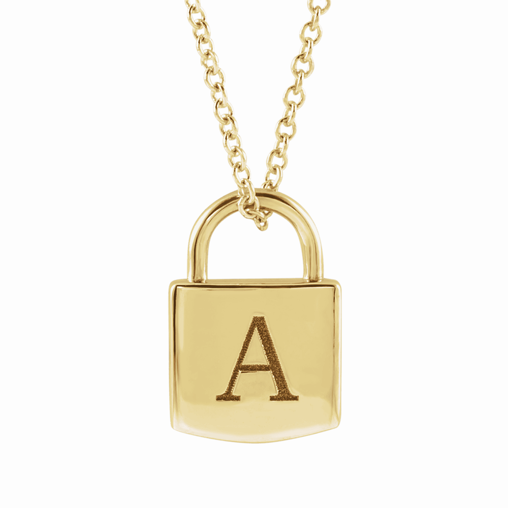 Customize your own Engraved Lock Necklace in 14K gold or sterling silver. Personalize the bold lock charm with up to 3 initials for a modern, meaningful gift. Handcrafted in the USA and designed to be layered or worn solo, this personalized necklace is perfect for marking milestones, celebrating loved ones, or gifting with intention.