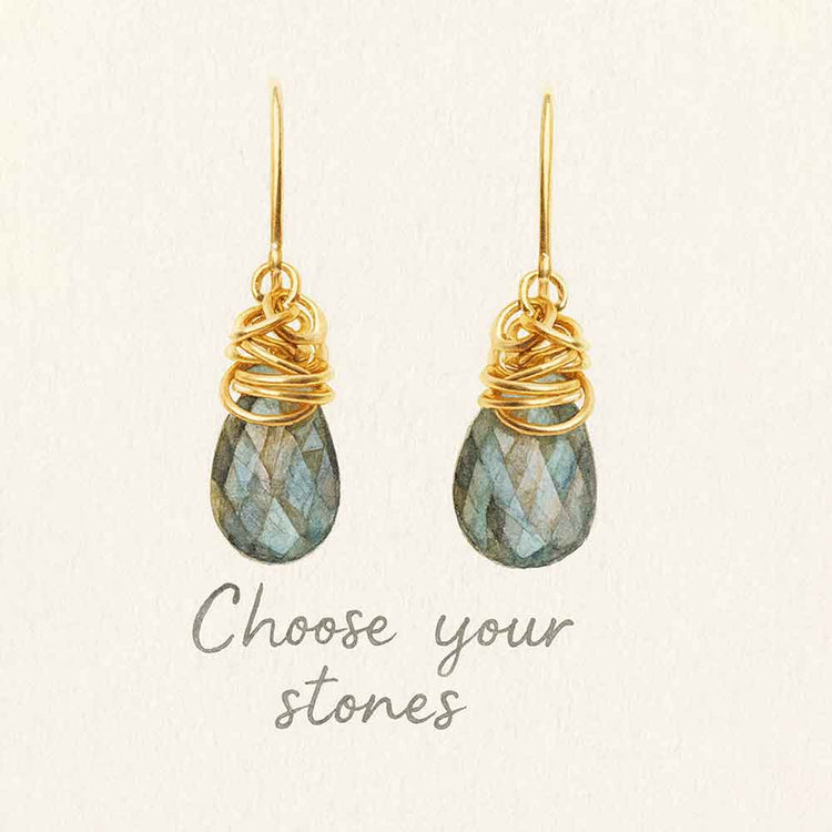 Each pair features a slim gold french wire hook, a hand-wrapped coil nest of gold wire loops, and an elongated faceted teardrop briolette. The result is a lightweight 2-inch drop that moves well and catches light without feeling heavy. Stone size ranges from 11 to 15mm depending on the gemstone you select.