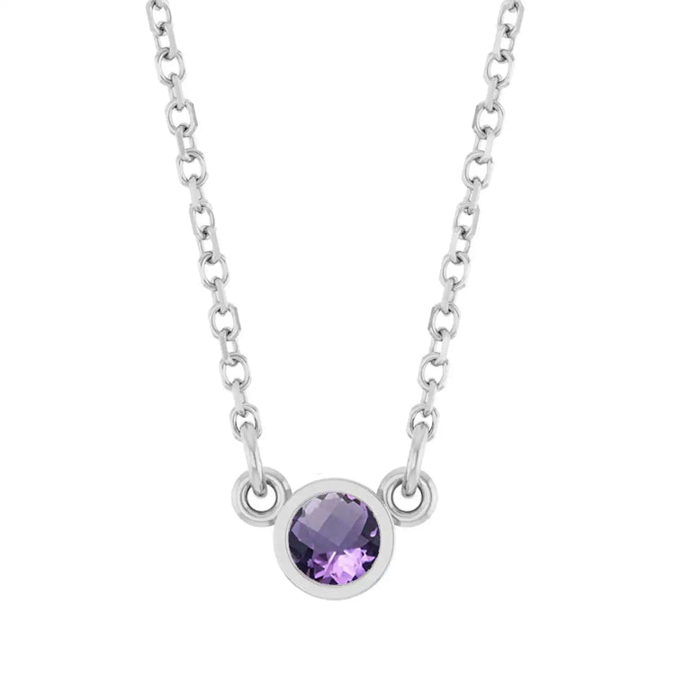 Amethyst has been revered across cultures for millennia, by ancient Greeks who carved wine cups from it, by medieval clergy who set it in rings, by anyone who has ever been stopped by its depth of color. That same violet richness, distilled into a single 3mm stone, sits at the collarbone here with a quiet authority that needs nothing else around it.
