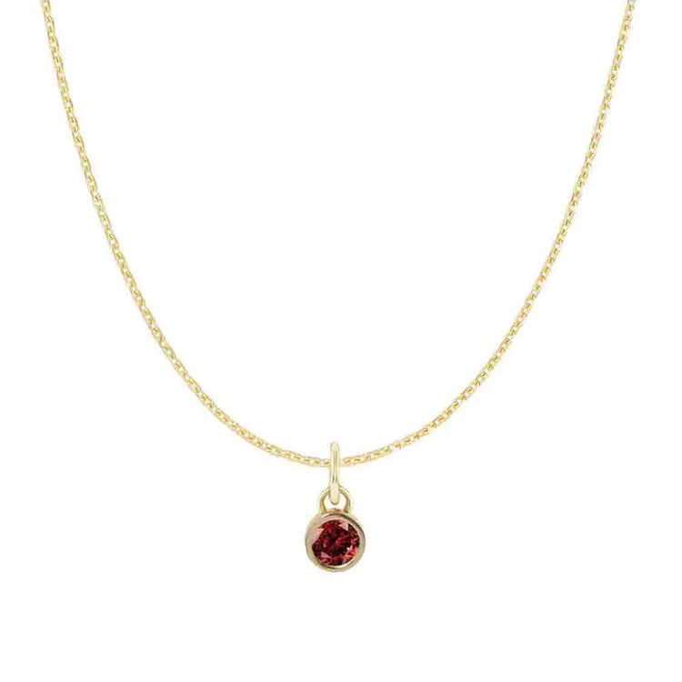 Natural garnet birthstone charm necklace bezel-set in solid 14K recycled gold. January's birthstone, known for its deep warmth and connection to passion and loyalty. Handcrafted to order in Colorado.