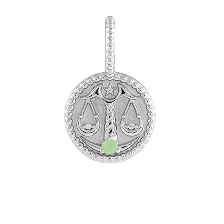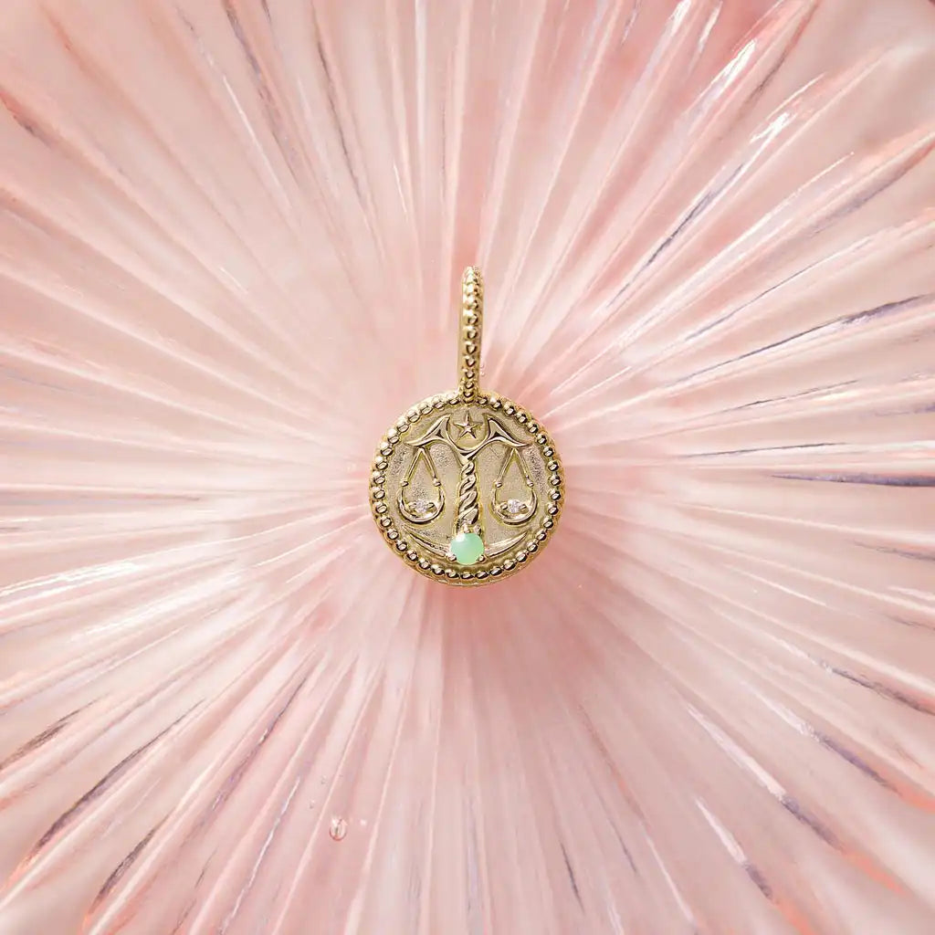 Libra is harmony in motion—poised, artful, and quietly magnetic. Our handcrafted Libra Zodiac Medallion Charm honors that equilibrium with a luminous silhouette that feels instantly personal. Your Libra symbol is embossed on a softly textured disc of recycled 14K gold or sterling silver, accented with a vivid 2mm chrysoprase and a delicate flush-set diamond. Flip it to reveal a carved Libra glyph that lets the gemstone’s serene green glow through—two looks, one modern talisman.