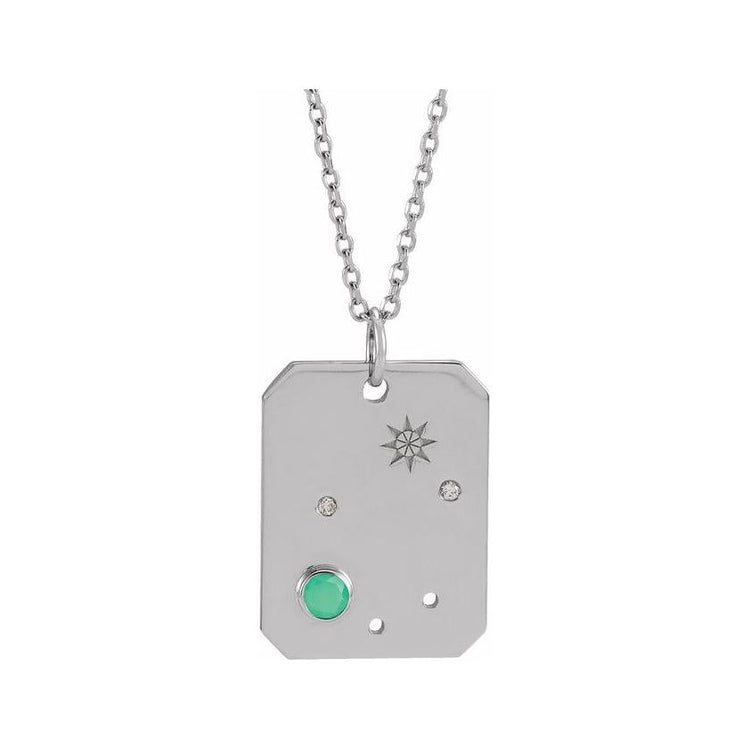 A Libra constellation charm necklace with diamond accents mapping the Libra stars, centered on a 2.5mm natural chrysoprase. Two-sided pendant. 14K gold or sterling silver cable chain. Handmade in the USA.