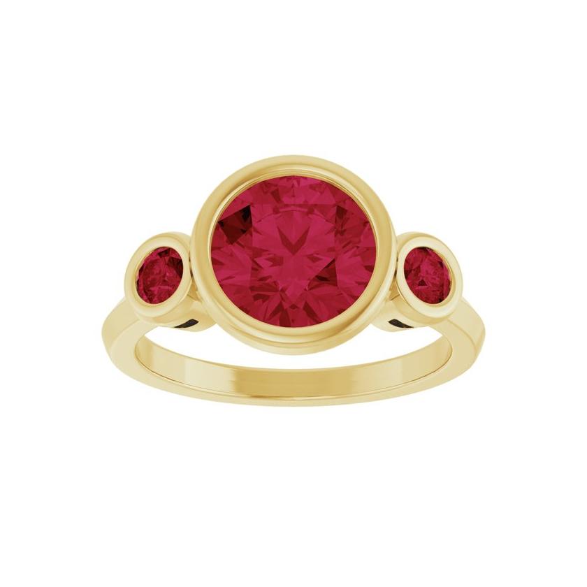 Our Three Stone Ruby Cocktail Ring is a vibrant expression of passion, power, and purpose. At its center shines an 8mm round lab-created ruby — 2.75 carats of velvety red brilliance — flanked by two luminous 3mm round lab-created accent rubies. The symmetrical three-stone setting balances bold elegance with effortless allure, creating a modern heirloom that speaks in color and shines with conviction.