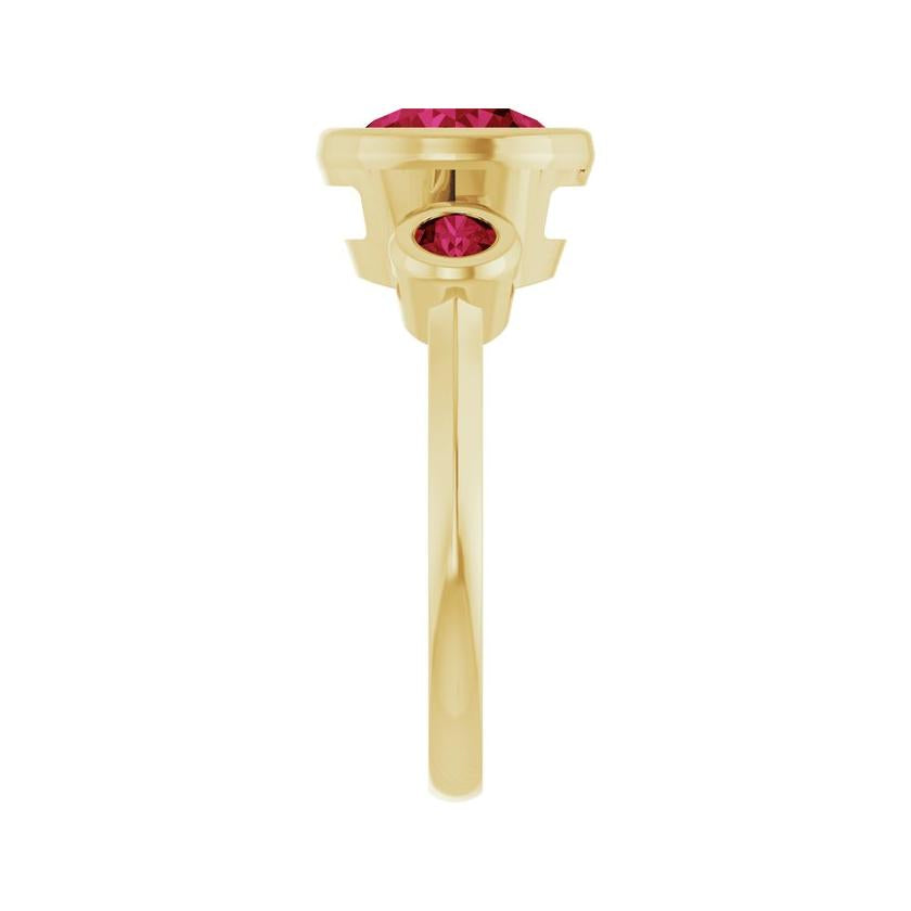 • Side Stones: Two 3mm Round Lab-Created Rubies (~0.15 CT each)