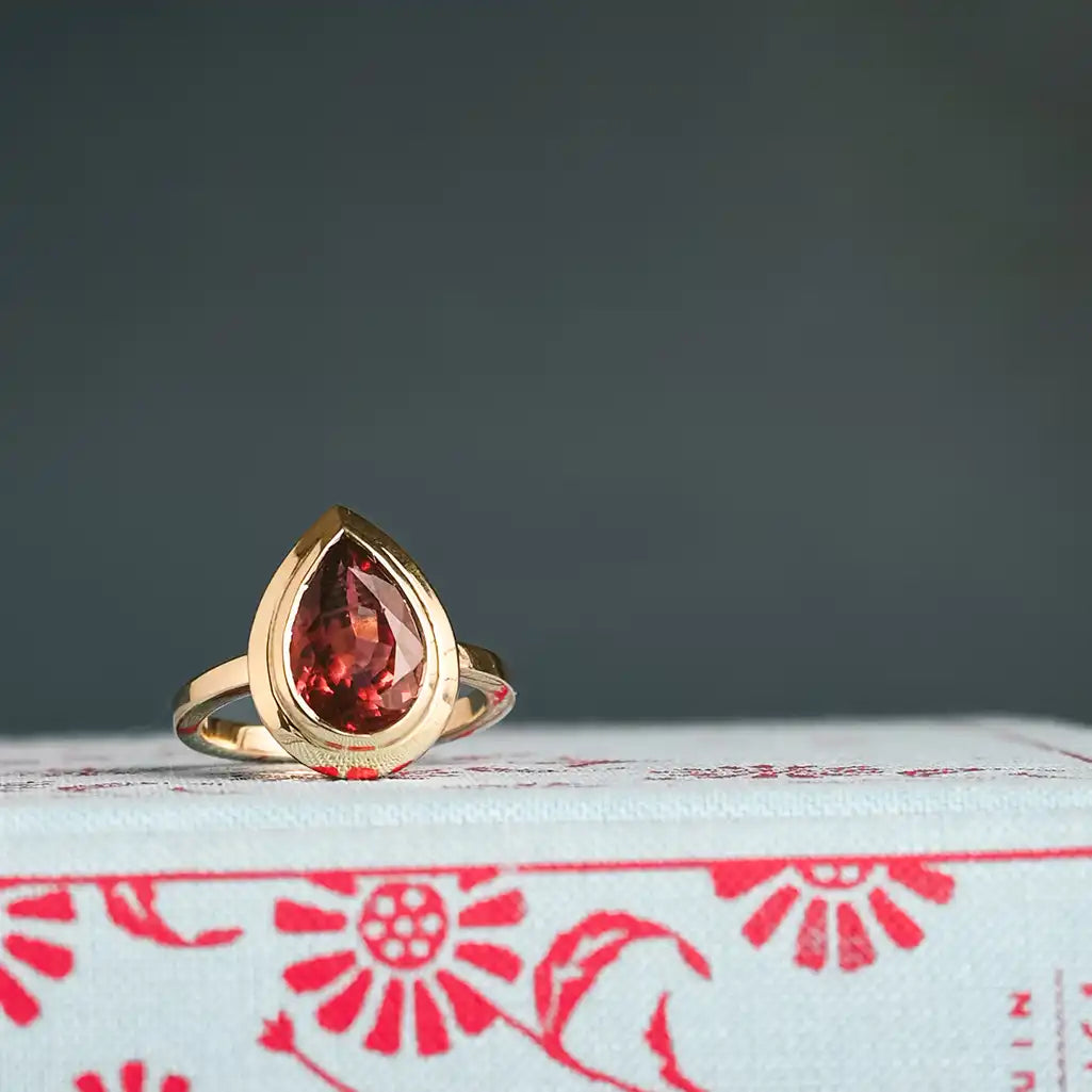 Teardrop Tourmaline cocktail ring with 3 CT gemstone in sleek bezel setting. Recycled 10K yellow gold. Handmade in USA. Bold modern sustainable statement ring.