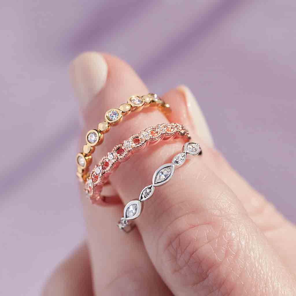 Select your accent stone to complete this setting. This setting features round stones highlighted by a bezel-set accent stones.