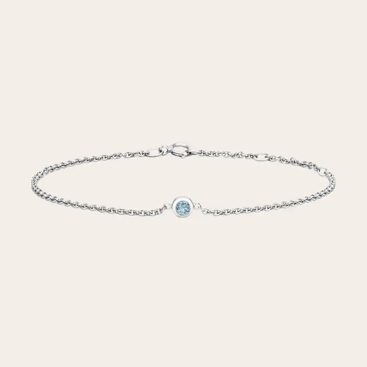Aquamarine is the birthstone for March and is associated with serenity, clarity, and courage. Its connection to water has made it a symbol of calm and perspective across many cultures. Available in solid 14K yellow gold, white gold, rose gold, or sterling silver, the adjustable chain fits from 6.5 to 7.5 inches.