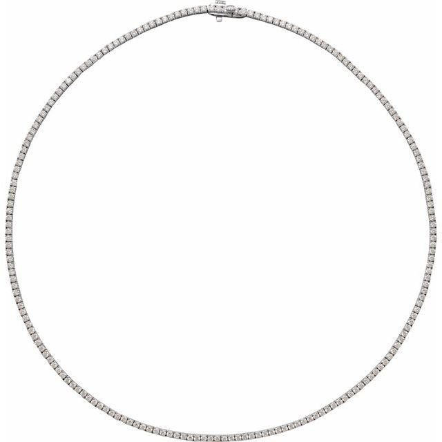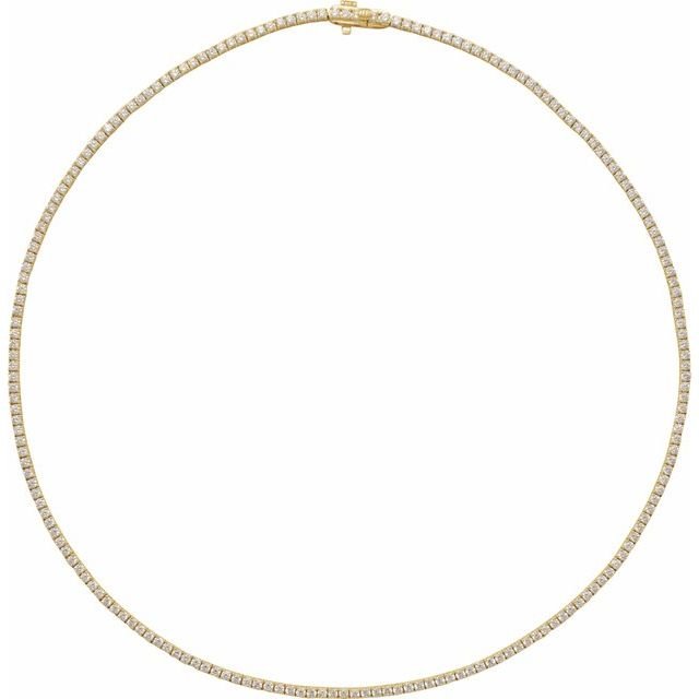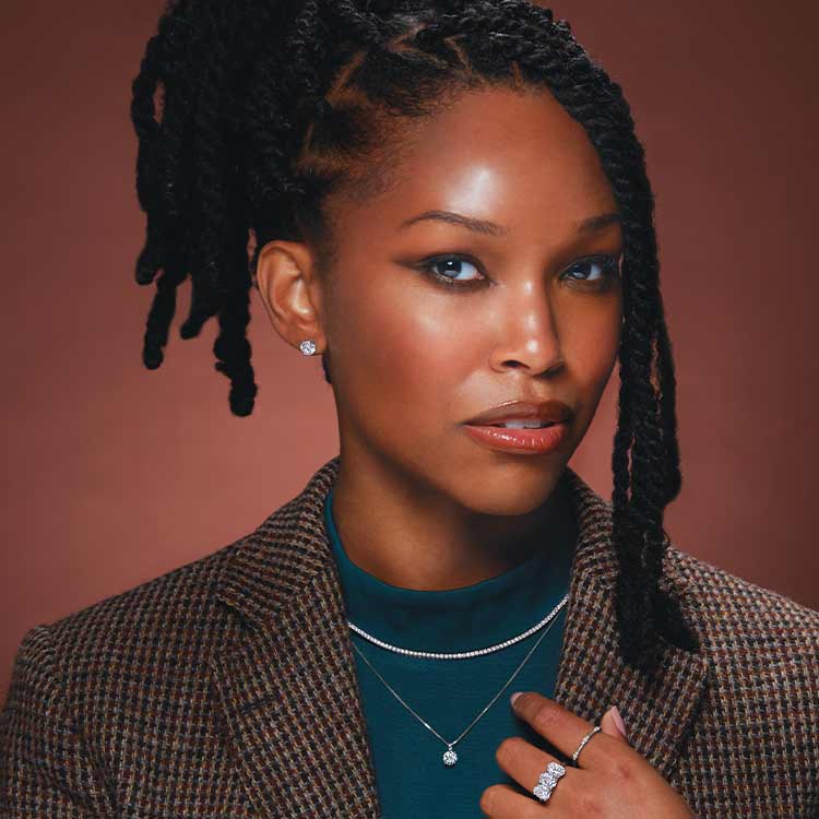 It’s a simple design: a neat collar of sparkling white diamonds (5.75 carats of conflict-free environmentally friendly, to be precise) set in recycled 14-karat gold. It’s accented by an offset section of gems graduating in size — somehow both timeless and modern.