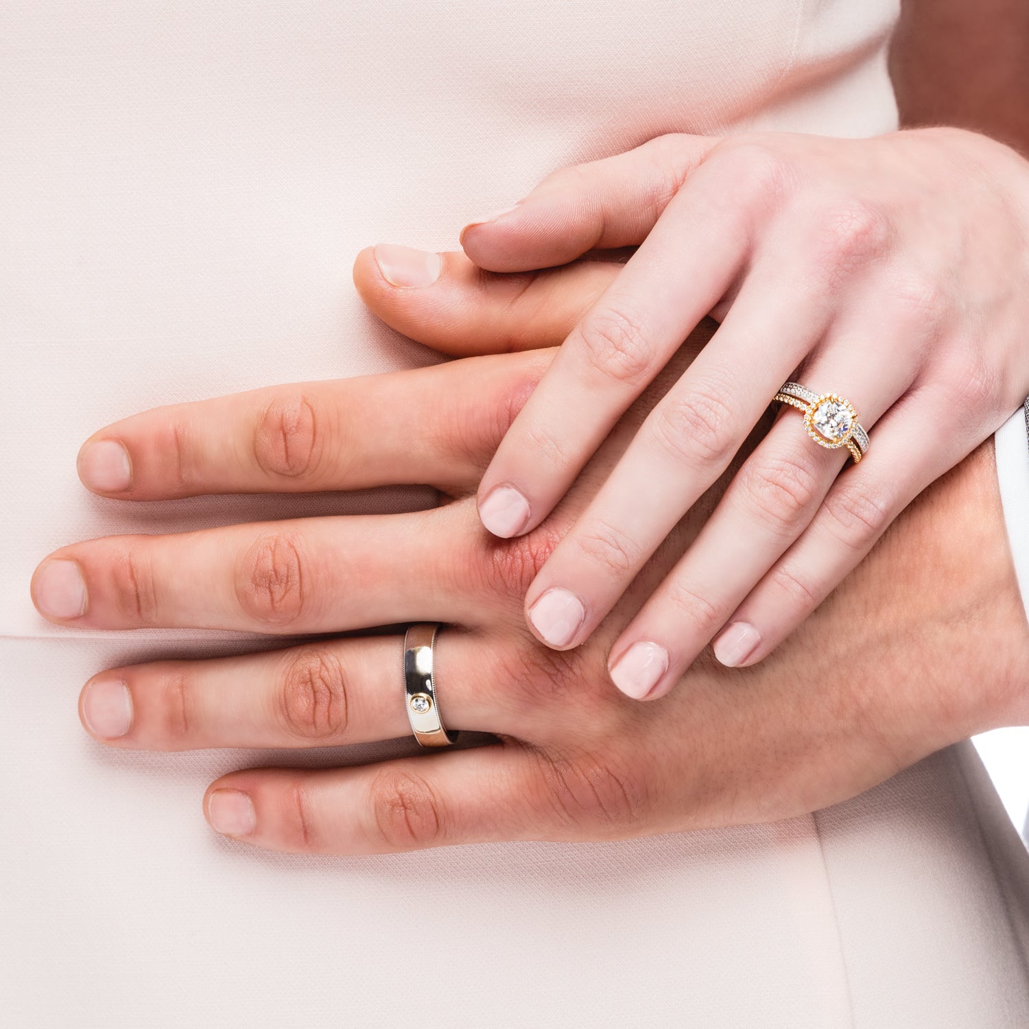 Yes—its low, slim profile is designed to nestle alongside most solitaire and bezel-set engagement rings. If you’d like us to confirm fit with your specific ring, send a side-profile photo—we’re happy to advise.