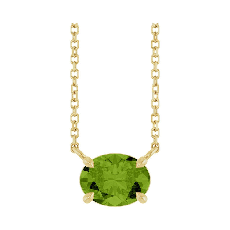 A Fresh Start in Vibrant Green. This East West Oval Peridot Necklace features a brilliant 8x6mm peridot set sideways in a modern prong setting—bringing light, energy, and renewal to your everyday look. Crafted with care in the USA using recycled gold or sterling silver, it’s a joyful way to celebrate August birthdays or simply embrace peridot’s uplifting power.